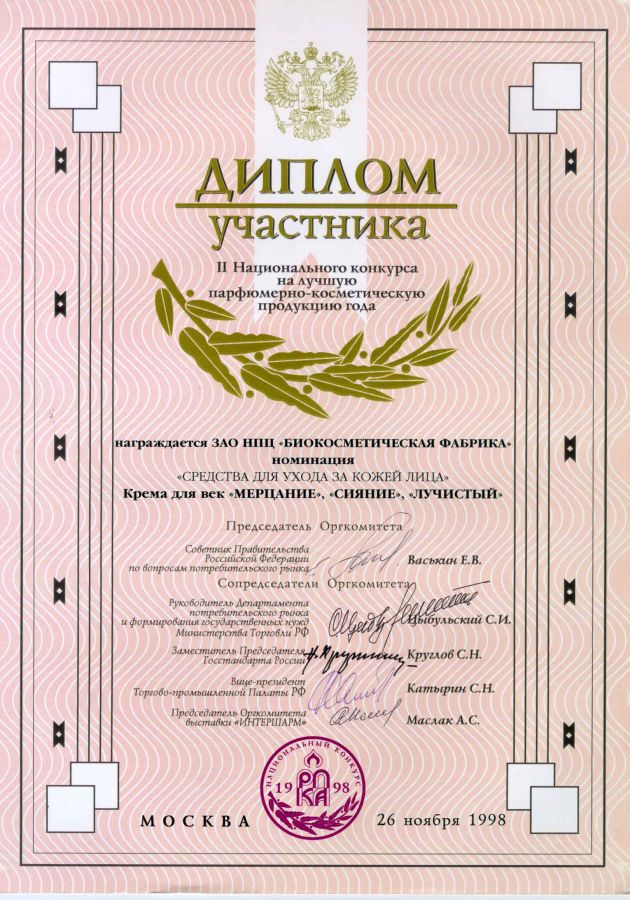 Крему для век «Лучистый» в 2003г. присвоен знак качества "Новосибирская марка".
